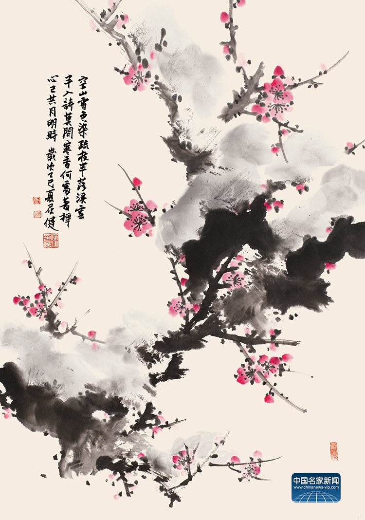 Qu Jian’s freehand flower-and-bird paintings radiate luminous clarity. His ink-splashed compositions exude fresh vitality. His masterful technique involves meticulously refining the lines that define the contours of rocks and trees, which are enhanced by layered ink washes that create dynamic gradations of dryness and moisture. The branches and rocks possess a strikingly textured solidity, their outlines blend fluidity and solidity, masterfully embodying the harmonious interplay of brushwork and ink in traditional Chinese art. Demonstrating extraordinary mastery, Qu seamlessly integrates brush, ink, and color into a unified expression, revealing an artistic vision that transcends the conventional constraints of traditional techniques.