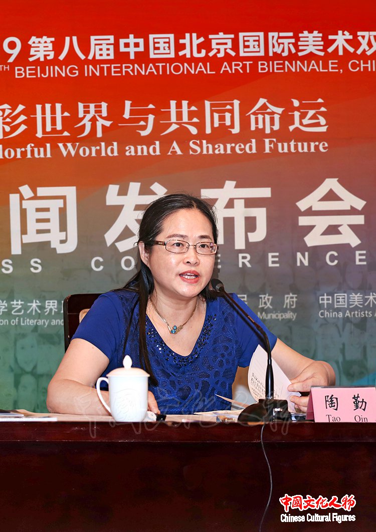北京双年展策委会召集人、中国美协美术家协会分党组副书记、巡视员陶勤主持新闻发布会,并介绍了展厅的具体布置,以及2019第八届中国北京国际美术双年展的部分主题作品