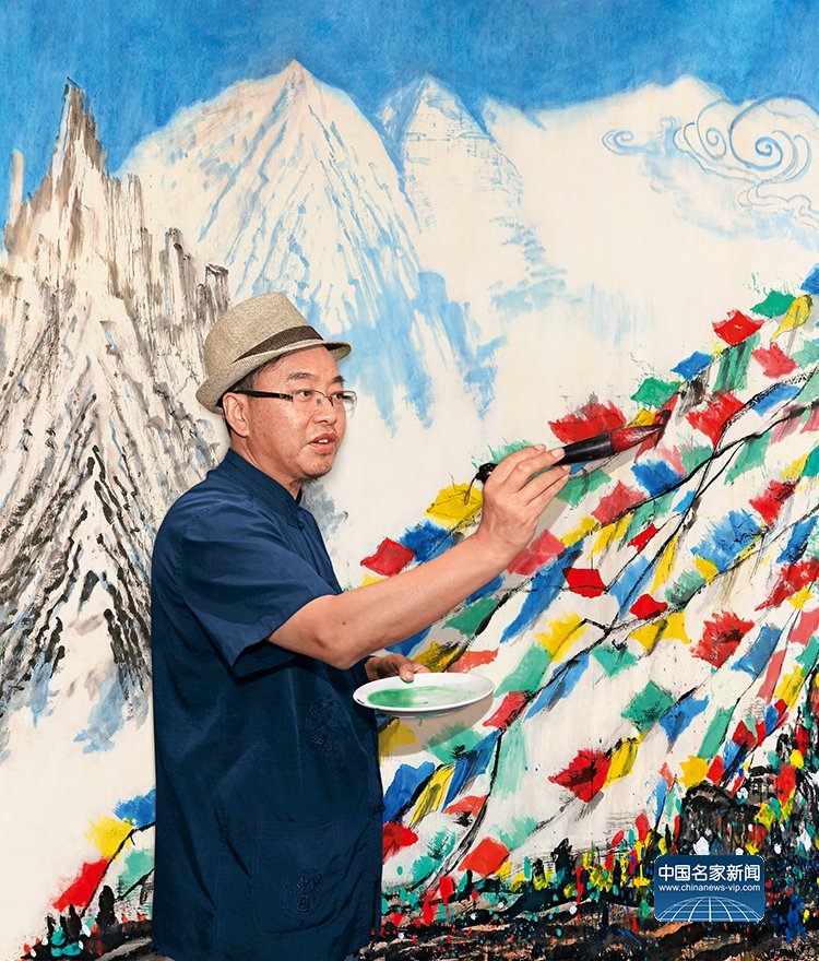 Rong Tie was born in the ancient city of Zhenjiang, Jiangsu Province. He began studying calligraphy at the age of six, followed by painting at fifteen, and seal carving at sixteen. He was mentored by renowned masters such as Lin Sanzhi and Sha Manweng. In late 2014, in his fifties, Rong Tie embarked on a heartfelt journey to Tibet as part of the seventh group of cultural cadre aid workers sent by the Ministry of Culture of the People’s Republic of China. His experiences on the Tibetan Plateau enriched both his life and artistic style. In 2015, Rong Tie achieved a remarkable feat: at the Everest Base Camp, 5,200 meters above sea level, he held a 15-kilogram brush and, over six grueling hours, created a 105-meter-long scroll combining painting, Tibetan calligraphy, and seal carving. This monumental work, titled Depicting the World’s Summit: Blessings from the Sacred Land, was broadcast live globally and entered the Guinness World Records. Through this extraordinary effort, Rong Tie showcased the unique splendor of Tibet to the world.