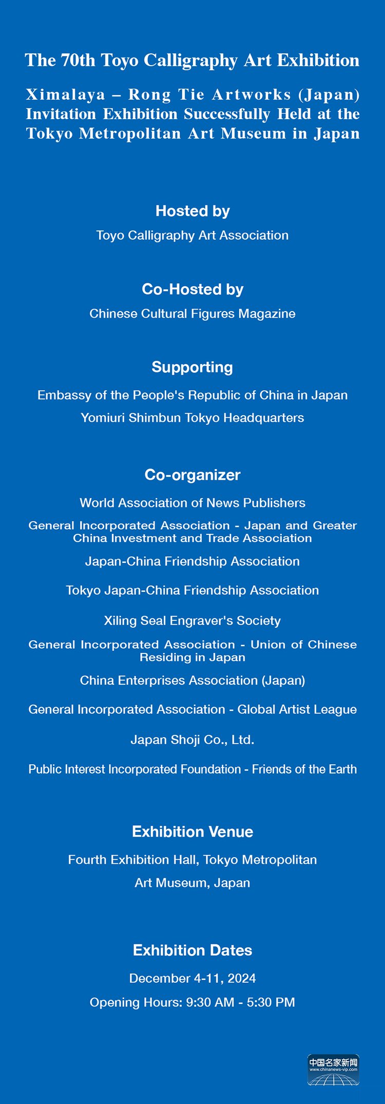 the 70th Oriental Calligraphy Art Exhibition - Ximalayan - Rong Tie Art Invitation (Japan) Exhibition will take place from December 4 to December 11 at the Tokyo Metropolitan Art Museum