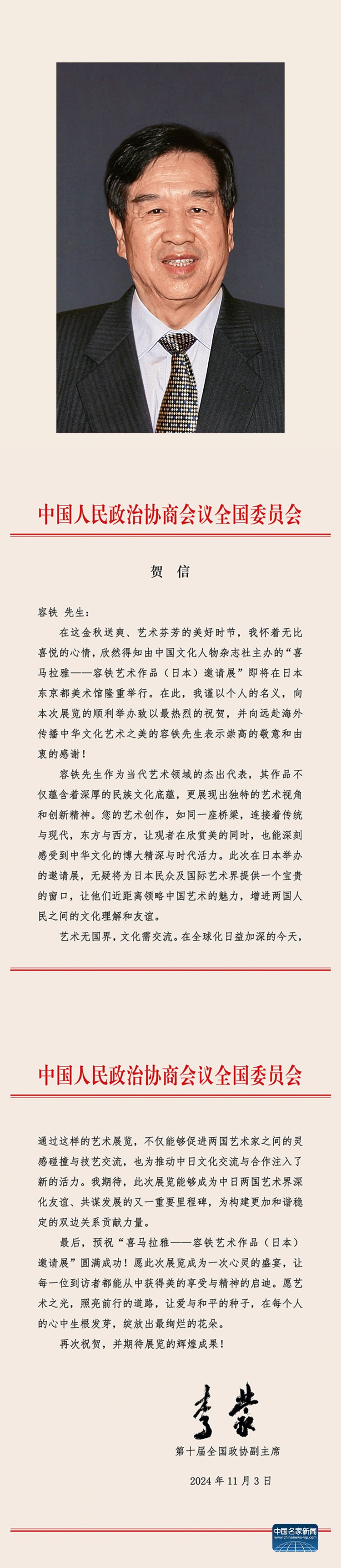 A Congratulatory Letter from Li Meng, Vice Chairman of the 10th Chinese People's Political Consultative Conference, for the Ximalayan - Rong Tie Art Invitational Exhibition in Japan