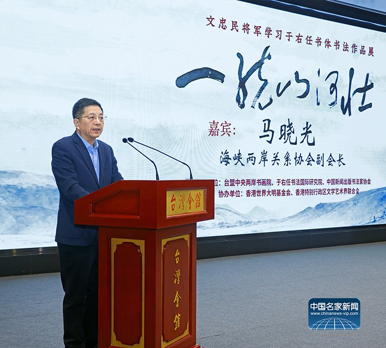 “葬我于高山之上兮,望我故乡。故乡不可见兮,永不能忘。”马晓光在讲话中深情引用于右任《望大陆》诗句,坦言这首诗所抒发的两岸隔绝之痛,早年便给他带来强烈冲击。他强调,中华文化是联结两岸同胞的精神纽带,书法艺术更是其中璀璨瑰宝,文忠民将军的作品展不仅是一次艺术呈现,更是对两岸同文同种、血脉相连的生动诠释,为推动两岸关系和平发展、增进同胞心灵契合注入了文化力量。