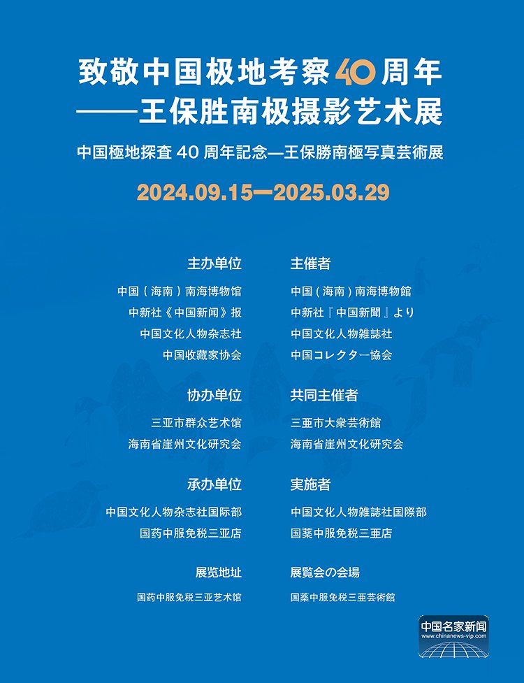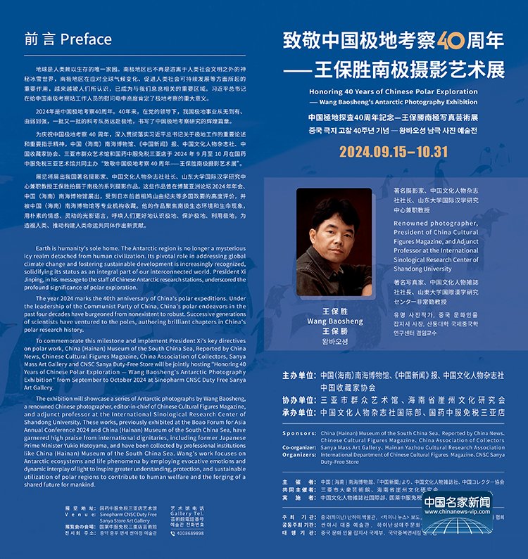 由中国(海南)南海博物馆、中国收藏家协会、中国文化人物杂志社联合主办,海南群众艺术馆协办,中国文化人物杂志社国际部、中服(三亚)免税品有限公司承办的“致敬中国极地考察40周年——王保胜南极摄影艺术展”于2024年9月15日在国药中服免税三亚艺术馆正式启幕