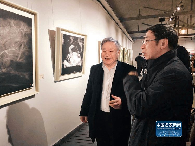 Mr. Li Geng and Mr. Yin Shuangxi, a critic, communicate in front of the exhibition works.