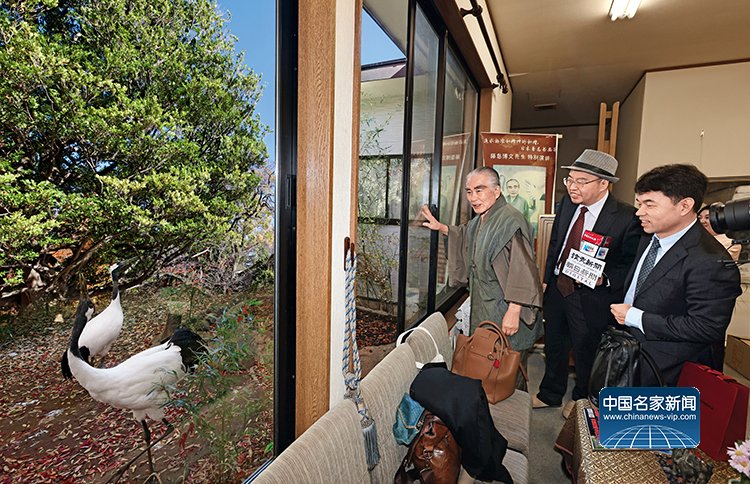 藤岛博文自幼便喜爱中国传统文化,多次访问中国,主张中日世代友好,曾绘制《奥运五鹤图》祝愿2008年北京奥运会成功举办。他特地向容铁一行展示了自己少年时期保存至今的中国古典文学书籍,以及自己的最新作品《世界和平》装饰瓷盘。藤岛博文擅长画鹤,每天与鹤生活在一起,他还向大家介绍了自家园中精心养育了三十多年的、来自中国的两只仙鹤。