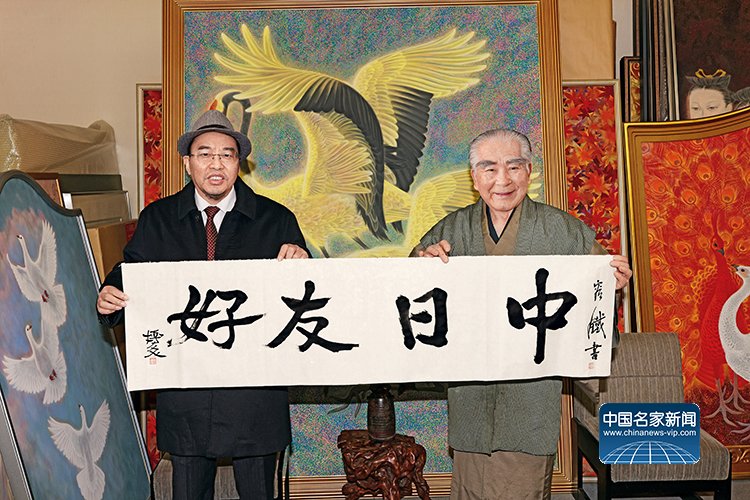 容铁与藤岛博文一起合作创作书法作品《中日友好》并合影留念