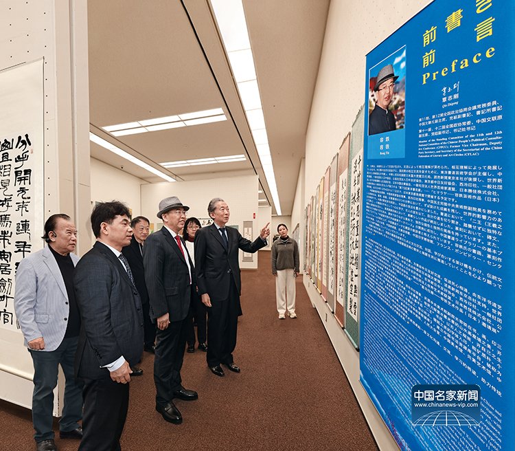 日本前首相鸠山由纪夫在中国文化人物杂志社社长王保胜、东洋书道艺术学会会长松本启祐、全日本华侨华人春晩总导演程波、展览艺术家容铁的陪同下参观第十一届、十二届全国政协常委,中国文联原副主席覃志刚为此次展览撰写的前言