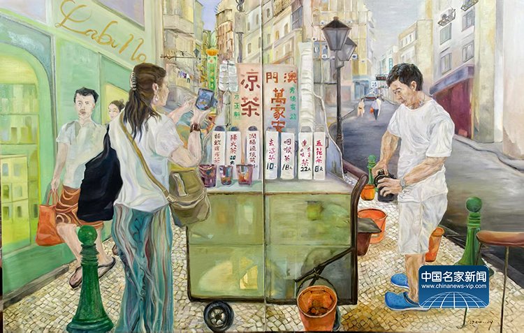 作为一位扎根澳门二十多载的创作者,Lily此次展出的28幅画作,包含油画、丙烯、水彩、墨彩,正是“此”与“彼”的交织产物。“画说澳门凉茶”系列,见生活之道;“澳门烟火”系列,见时间之痕;“古往今来”澳门历史人物系列,是与先贤的对话,借由前辈们的精神火炬,探寻一座城市的历史脉络。