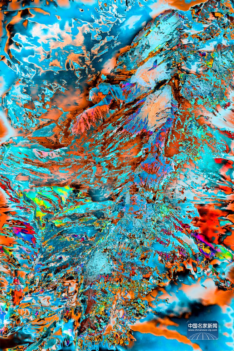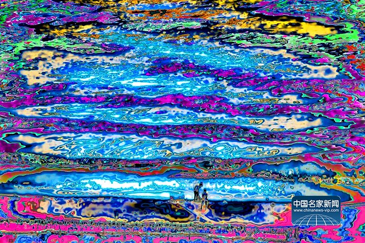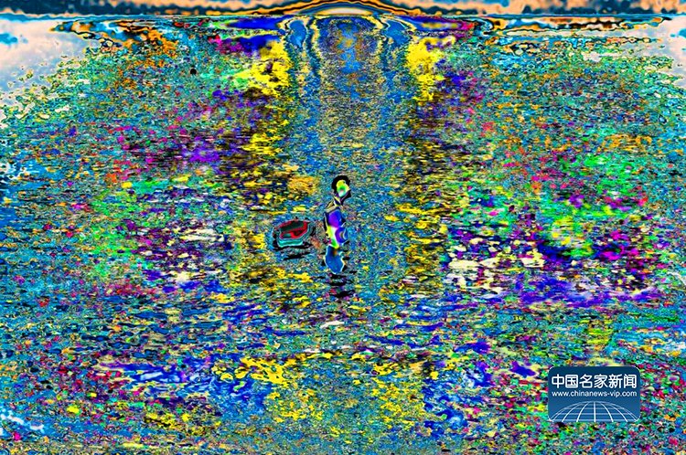 官宏滔进一步阐释,数码摄影的本质是数据捕捉,而人类习惯的颜色不过是人眼与大脑的主观处理结果,现实本身拥有无限种可能性,这与量子力学中的“观测者效应”不谋而合——观测行为本身会影响被观测对象,所谓“现实”,不过是主观视角下的定型认知。此次展出的《非观:天开之时》(2020)、《非观:最后的浸礼》(2023)、《非观:破译中50%》(2022)、《非观:最后的冬泳》(2023)等系列作品,完整呈现了他的创作脉络:从盘古开天的神话意象,到信息之海的个人感悟;从“山是水、水是山”的万物共生理念,到数字时代人类生存状态的叩问,每一件作品都融入了他跨越中西文化的生活体验,将抽象的哲学思考转化为可感知的视觉艺术。