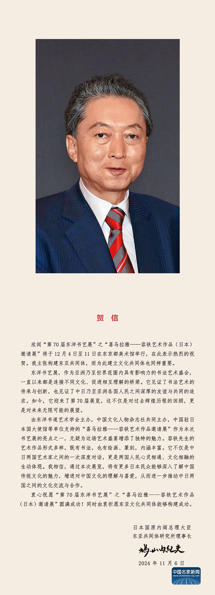A Congratulatory Letter from Yukio Hatoyama, Former Prime Minister of Japan and Director of the East Asian Community Institute, for the 70th Japanese Painting and Calligraphy Exhibition - Ximalayan - Rong Tie Art Invitational Exhibition in Japan
