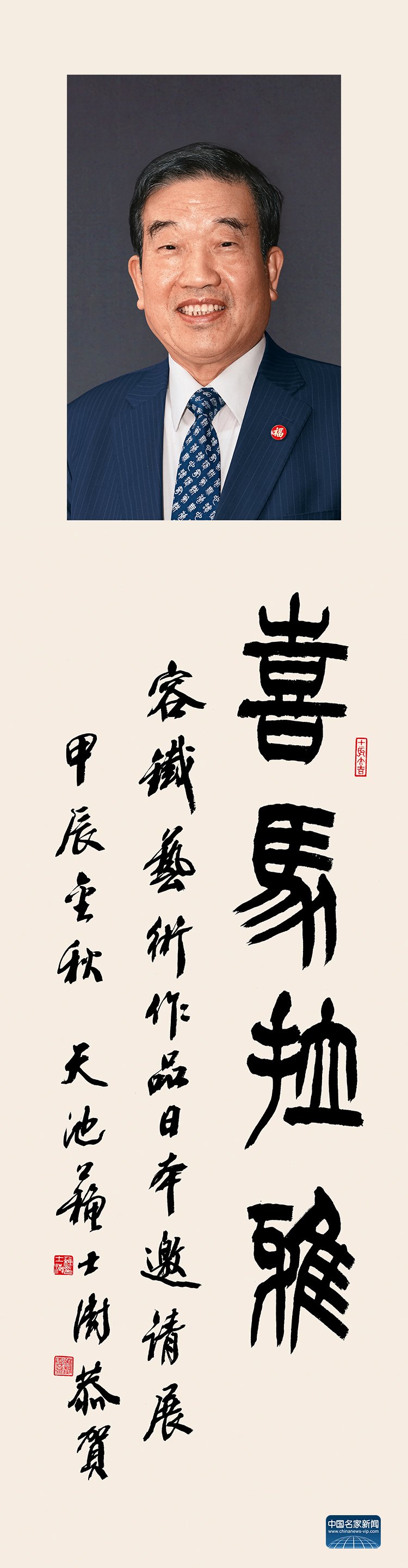 Su Shishu, Member of the Standing Committee of the 11th and 12th Chinese People's Political Consultative Conference, Deputy Director of the Calligraphy and Painting Studio of the Chinese People's Political Consultative Conference, and Honorary Chairman of the Chinese Calligraphers Association, inscribes the title for the Ximalayan - Rong Tie Art Invitational Exhibition in Japan