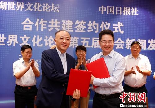 8月28日,太湖世界文化论坛与中国日报社合作共建签约仪式暨第五届年会新闻发布会在北京举行。据悉,太湖世界文化论坛将于10月17日-19日在北京召开以“文化对话:构建人类命运共同体”为主题的第五届年会。图为合作共建签约仪式。中新社记者 韩海丹 摄